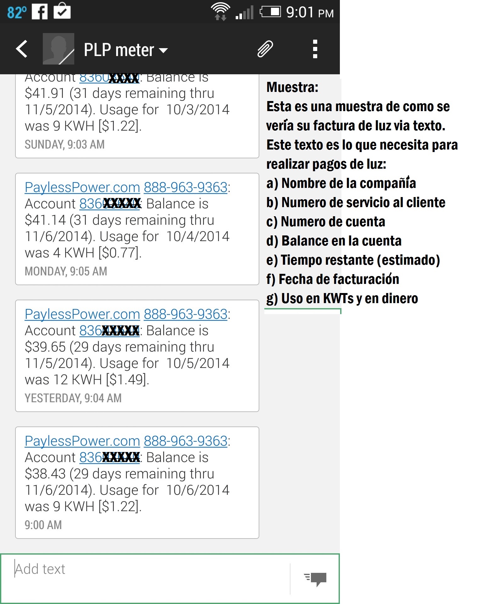 Si mide su servicio de luz con el celular, no tiene que correr a abrir su correo para ver su balance de energía, todo esta en su texto diario con el que puede llevar un registro de sus consumos de electricidad día a día. Así de fácil.