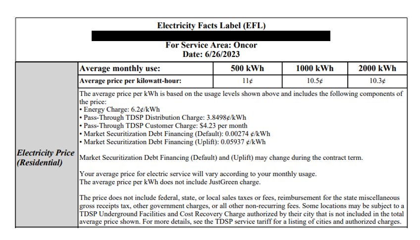 Every energy company must publish each of the energy plans they are offering. The EFL will display the terms and energy rates. However, there is a trick, most electricity plans fluctuate depending on the customers’ energy usage. I bet you didn’t know this. Yes, each plan can change the rate, without notice, if the consumers’ usage changes. There will be a rate if the house consumes 500, 1000, or 2000 kilowatts in a month.